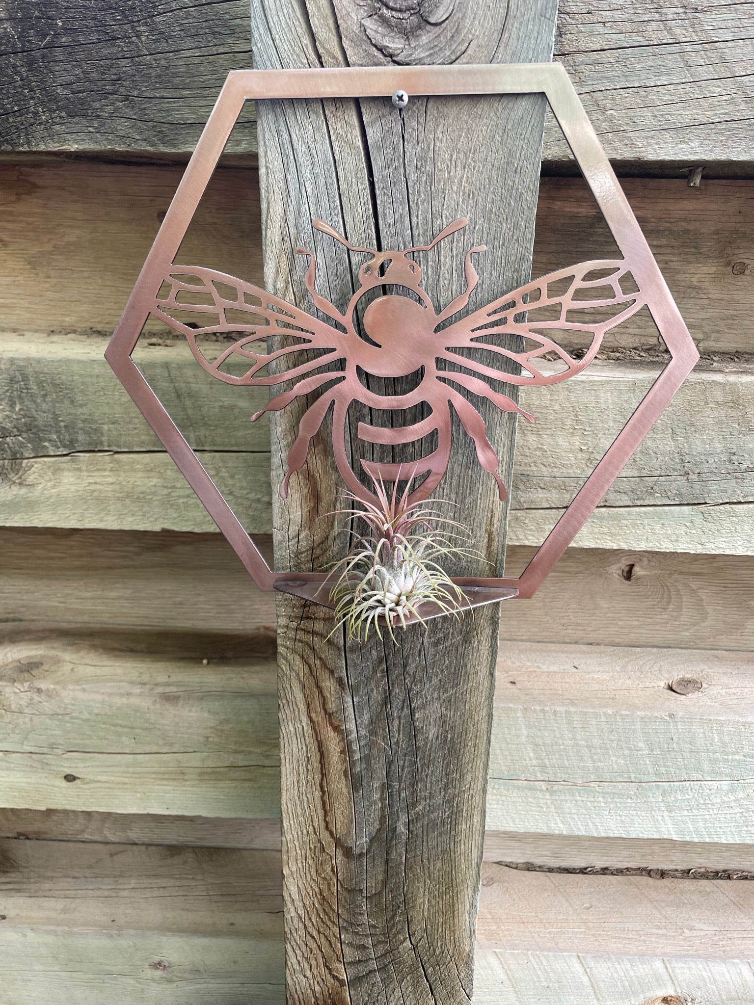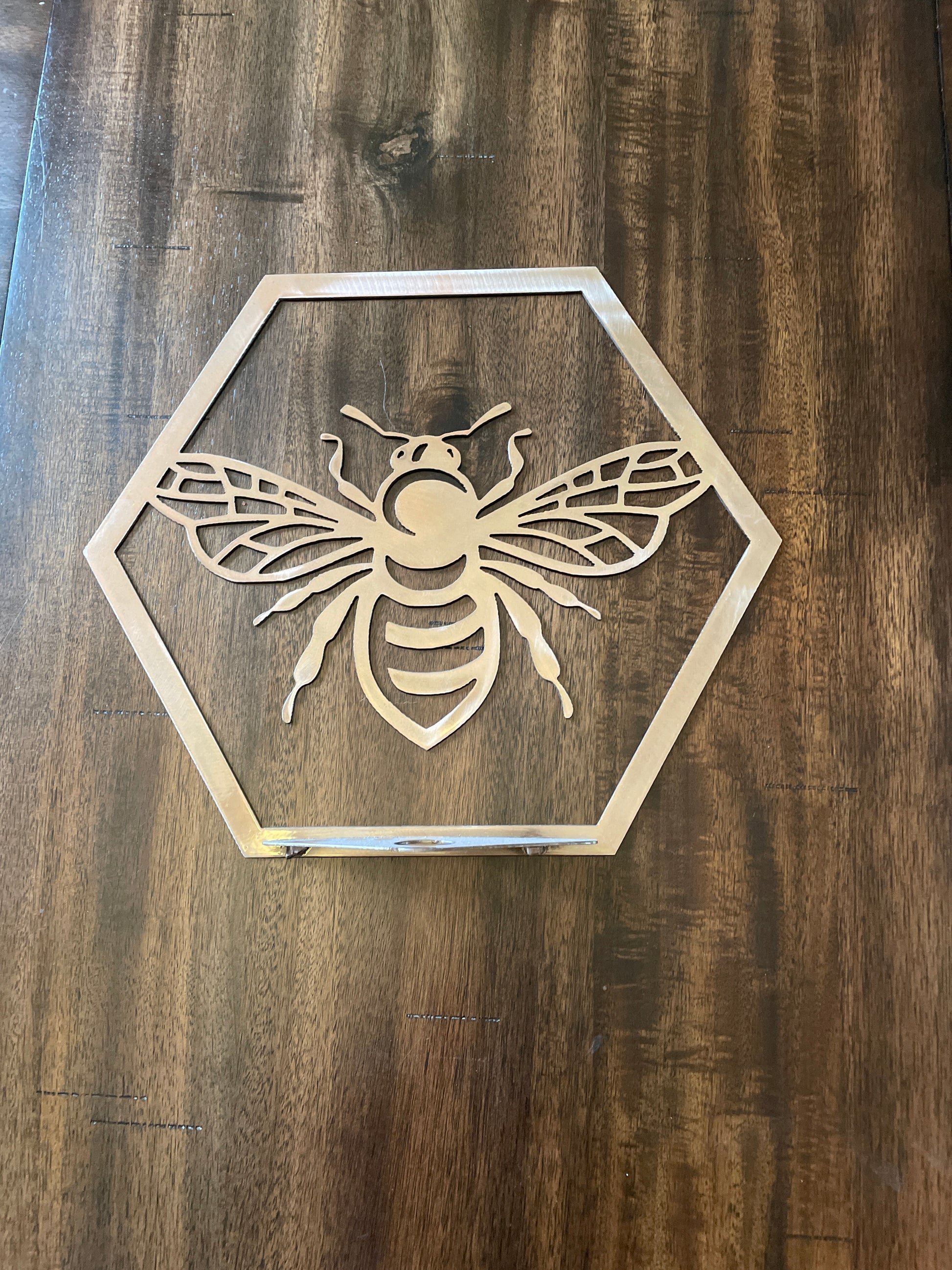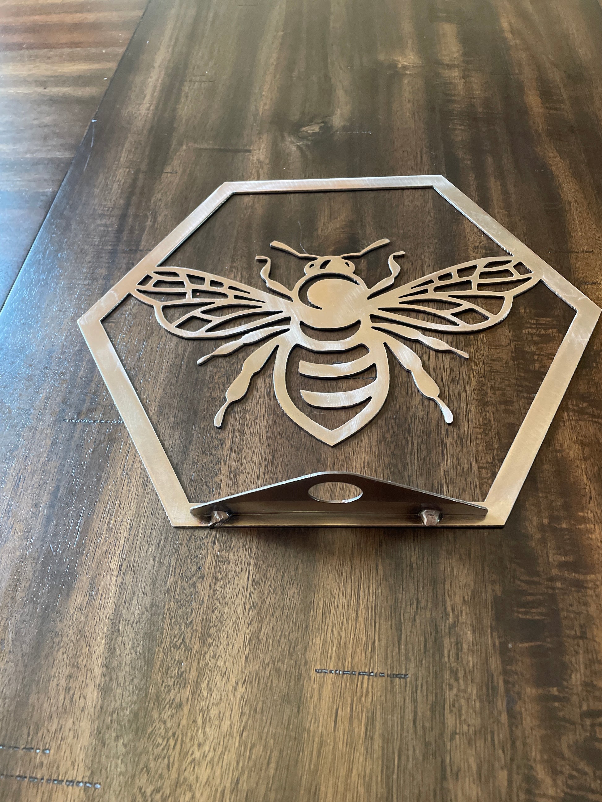 View the Bee Honeycomb, a captivating addition to our collection of honeycomb-inspired designs. This hand-crafted piece features a charming bee silhouette, adding a touch of nature and whimsy to your living space. Made from high-quality stainless steel, the Bee Honeycomb combines durability with a modern aesthetic. The bees are honored and revered in Colorado as the first pollinators. Many people participate in 'No Mow May' to help preserve our first pollinators. Add this piece to your collection to commemorate the importance of the bee to our local ecosystems.
