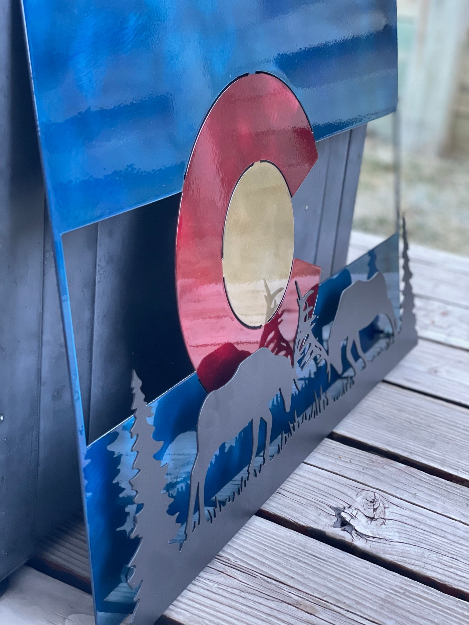 One of the first double-layered signs we've created, the iconic Colorado flag and a magnificent pair of sparing elk. This handcrafted masterpiece combines artistry and durability to create a truly captivating piece of décor for your home or office.