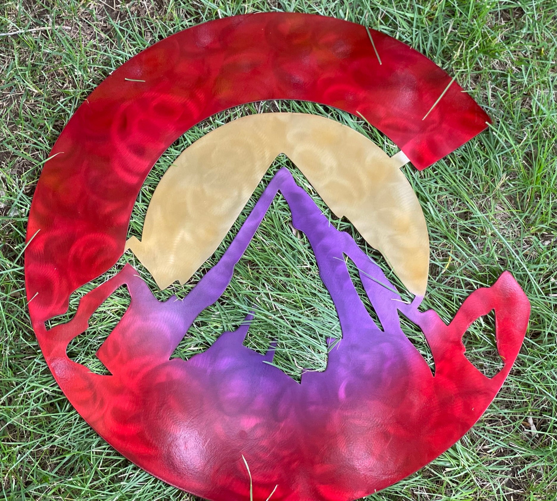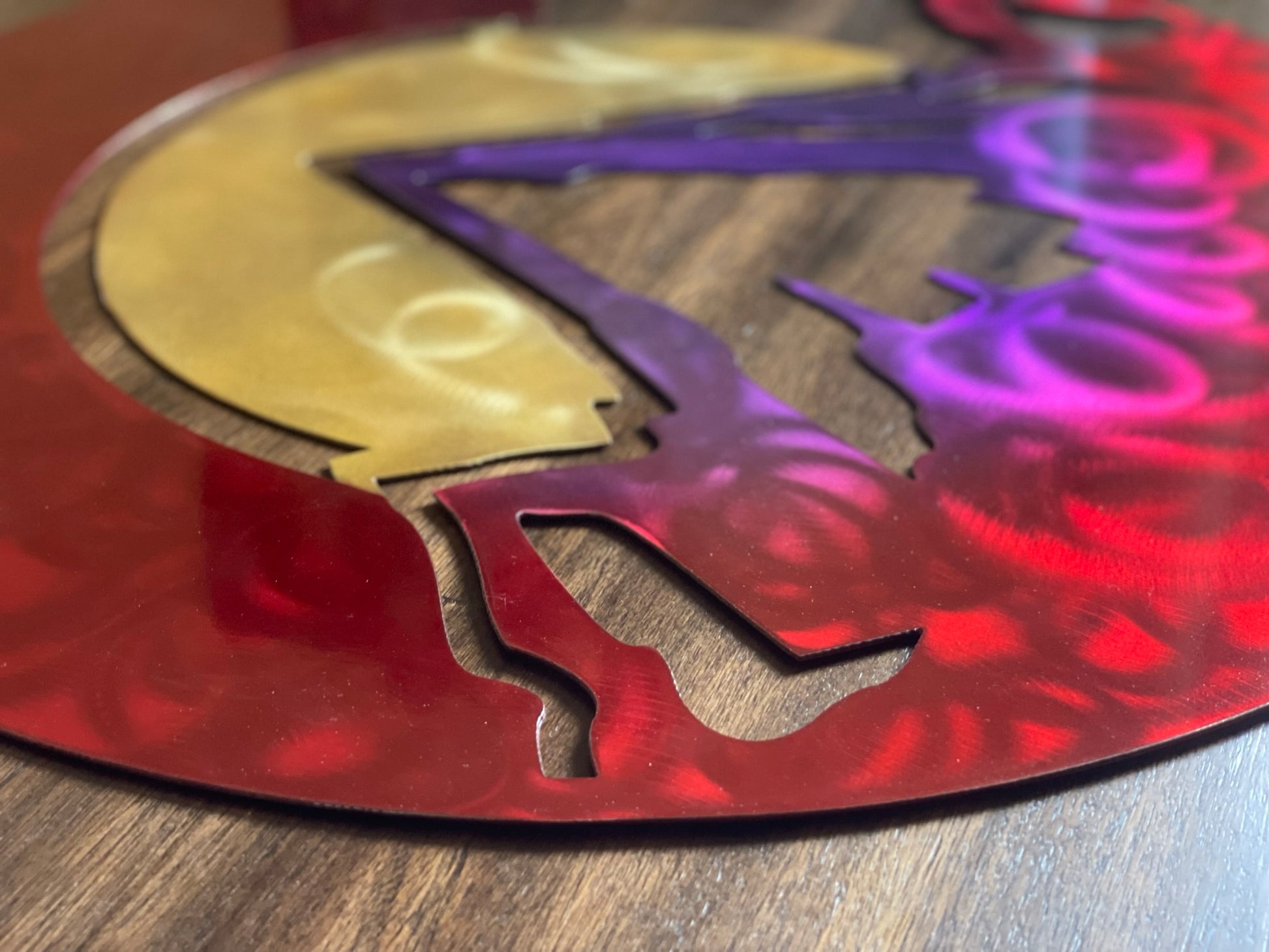 Looking further into the piece, you can see grind marks that are unique to each piece since they are created by hand. The candy powder coat is translucent and lets the view see the beauty of the metal below.