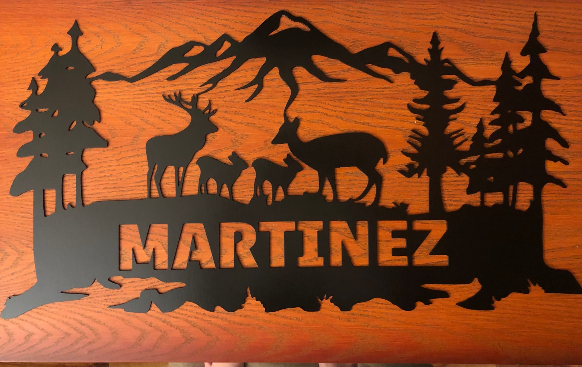 The Martinez is a blend of nature's beauty and personalized artistry. Crafted with attention to detail, this stunning sign showcases an enchanting elk family set against a majestic backdrop of towering mountains and lush trees. Each piece is meticulously designed to reflect your unique style and love for the outdoors.